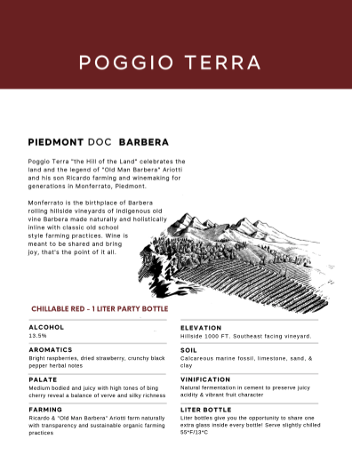 Poggio Terra is a generational estate if Monferrato, where II hectares of old-wine indegenous barbera thrive on limestone-rich soils full of marine fossils.